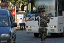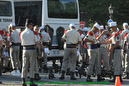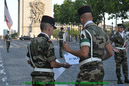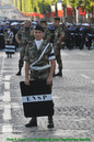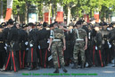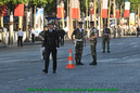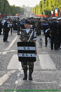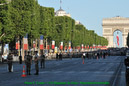 Dans le même temps d’autres groupes assurent la circulation des centaines de cars chargés de déposer les troupes à pieds sur l’avenue, avec un temps moyen de 5 minutes par régiment, puis de les diriger vers leur parking aux abords de la concorde. Pour ce faire, 2 postes de commandement sont établis, l’un à l’étoile et l’autre à la concorde. Armés de panneaux pour indiquer la zone de débarquement, les régulateurs veillent également à ce que les troupes n’empiètent pas sur les zones de circulation.