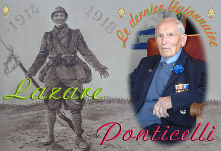 Lazare Ponticelli , 108 ans, engagé dès 1914, en trichant sur son âge, afin de servir la patrie qui l'avait accueilli d'Italie à 9 ans. Il sera rappelé en 1915 par son pays, entré à son tour dans la guerre et ne reviendra en France qu'en 1919.